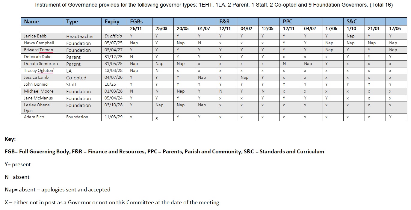 Other committees are put together to deal with other functions including Pay Review Appeal (PRA), Complaints, Grievances, Pupil Discipline, Reorganisation as and when needed. Additionally there are named governors alongside an independent advisor for the Headteachers’ Performance and Salary Review committee (HTPSR).