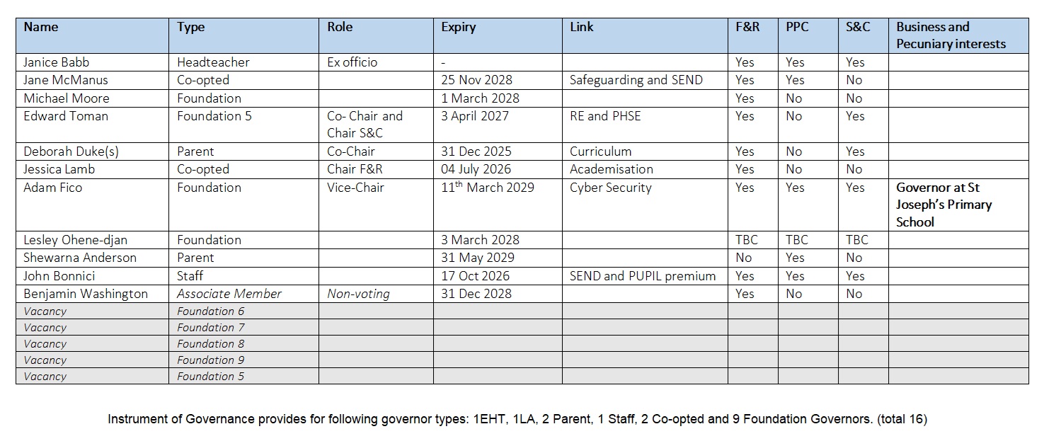 The Governing Body is constituted is constituted by an Instrument of Government made by the Archdiocese of Southwark. The Instrument sets out the categories, numbers and terms of office of governors: